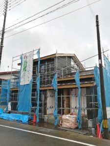 まだ足場がかかっていてお家の全貌がまだ見えてこないですがだんだんと完成が近づいてきました!